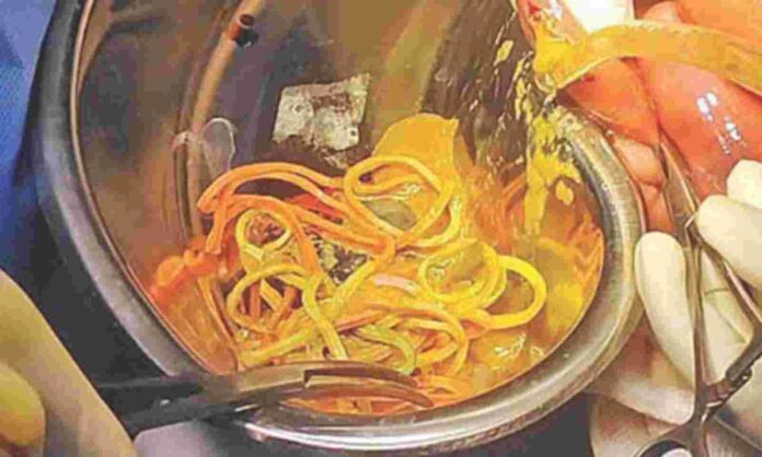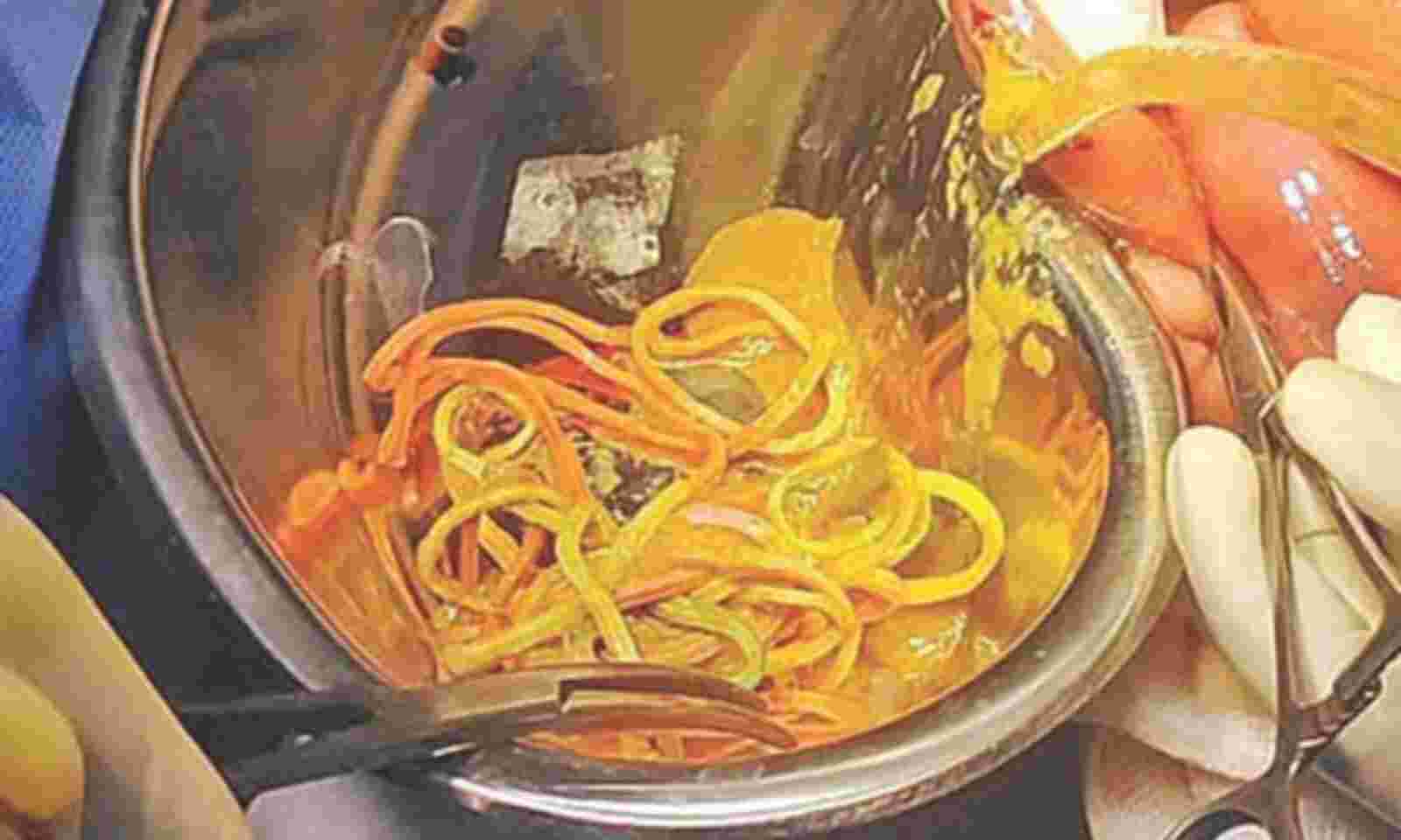 യുവതിയുടെ വയറ്റിൽ കണ്ടെത്തിയത് 41 റബ്ബർബാൻഡുകൾ. വയറുവേദനയെത്തുടർന്ന് വിവിധ ആശുപത്രിയിൽ ചികിത്സതേടിയെങ്കിലും മാറ്റമുണ്ടാകാത്തതിനെത്തുടർന്ന് നാലുദിവസം മുൻപാണ് നാൽപ്പത് വയസ്സുകാരി, പാറശ്ശാല സരസ്വതി ആശുപത്രിയിൽ ചികിത്സയ്ക്കെത്തിയത്. സ്കാനിങ്ങിൽ ചെറുകുടലിലെ തടസ്സമാണ് വയറുവേദനയ്ക്ക് കാരണമായതെന്നു വിദക്തർ കണ്ടെത്തി. തുടർന്ന് രോഗിയെ അടിയന്തര ശസ്ത്രക്രിയയ്ക്കു വിധേയമാക്കി. ശസ്ത്രക്രിയയിൽ ചെറുകുടലിനുള്ളിൽ കാണപ്പെട്ട മുഴ തുറന്നുനോക്കിയപ്പോഴാണ് റബ്ബർബാൻഡുകൾ ഒന്നിനോടൊന്ന് ചേർന്ന് പന്തുപോലെ കണ്ടെത്തിയത്. 41 റബ്ബർബാൻഡുകളാണ് ആരോഗ്യവിദക്തർ നീക്കം ചെയ്തത്. സ്വകാര്യ സ്ഥാപനത്തിൽ ജോലിചെയ്യുന്ന യുവതിയ്ക് റബ്ബർബാൻഡ് വായിലിട്ട് ചവയ്ക്കുന്ന ശീലം ഉണ്ടായിരുന്നതായി ബന്ധുക്കൾ പപറയപ്പെടുന്നു. റബ്ബർബാൻഡ് വിഴുങ്ങി ഇത്തരം അവസ്ഥയുണ്ടാകുന്നത് വളരെ അപൂർവമാണെന്ന് ആശുപത്രി മേധാവി ഡോ. എസ്.കെ. അജയ്യകുമാർ വ്യക്തമാക്കി