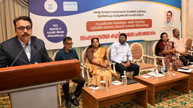 സാംക്രമികേതര രോഗങ്ങളുടെ വർധിച്ചുവരുന്ന ഭീഷണിയും കുട്ടികളുടെ ആരോഗ്യ അവകാശ സംരക്ഷണത്തിൽ ആവശ്യമായ നിക്ഷേപങ്ങളും എന്ന വിഷയത്തിൽ യൂനിസെഫുമായി സഹകരിച്ച് ബാലാവകാശ കമ്മീഷൻ സംഘടിപ്പിച്ച സംസ്ഥാനതല കൂടിയാലോചന യോഗം സംസ്ഥാന ബാലാവകാശ സംരക്ഷണ കമ്മീഷൻ ചെയർപേഴ്സൺ കെ.വി. മനോജ് കുമാർ ഉദ്ഘാടനം ചെയ്തു.