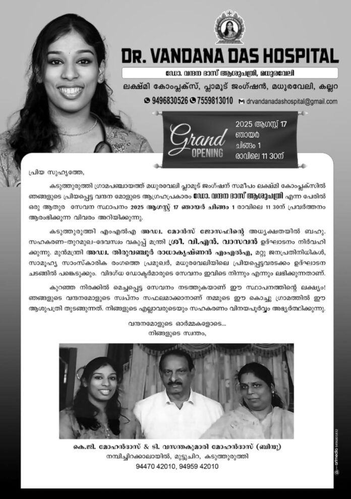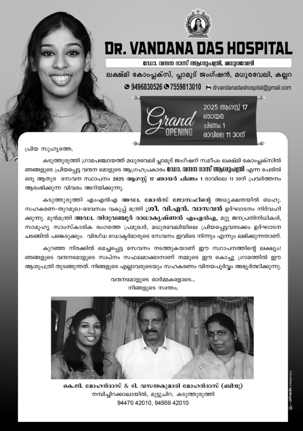 ഡോ. വന്ദന ദാസിന്റെ സ്മരണയ്ക്കായി മാതാപിതാക്കള് ഒരുക്കുന്ന ആശുപത്രിയുടെ ഉദ്ഘാടനം ഓഗസ്റ്റ് 17ന് നടക്കും. കോട്ടയം കടുത്തുരുത്തി മധുരവേലിയിലാണ് ആശുപത്രി സജ്ജമാകുന്നത്. ആശുപത്രിയുടെ ഉദ്ഘാടനം മന്ത്രി വി.എന് വാസവന് നിര്വ്വഹിക്കും. അഡ്വ. മോന്സ് ജോസഫ് എം.എല്.എ ചടങ്ങില് അധ്യക്ഷത വഹിക്കും. മധുരവേലി പ്ലാമൂട് ജങ്ഷന് സമീപം ലക്ഷ്മി കോംപ്ലക്സിലാണ് ആശുപത്രി. ദിവസവും രാവിലെ ഒന്പതു മുതല് വൈകിട്ടുവരെ ക്ലിനിക്കിന്റെ സേവനം ലഭ്യമായിരിക്കും. ഡോ. വന്ദനയുടെ സ്മരണയ്ക്കായി തുടങ്ങുന്ന രണ്ടാമത്തെ ആശുപത്രിയാണിത്. ആദ്യ ആശുപത്രി കഴിഞ്ഞ ഒക്ടോബറില് ആലപ്പുഴ തൃക്കുന്നപ്പുഴ വലിയപറമ്പില് പ്രവര്ത്തനം ആരംഭിച്ചിരുന്നു. കൊട്ടാരക്കര താലൂക്ക് ആശുപത്രിയില് ജോലി ചെയ്യവേ 2023 മെയ് 10നാണ് ഡോ. വന്ദന ദാസ് കൊല്ലപ്പെടുന്നത്.