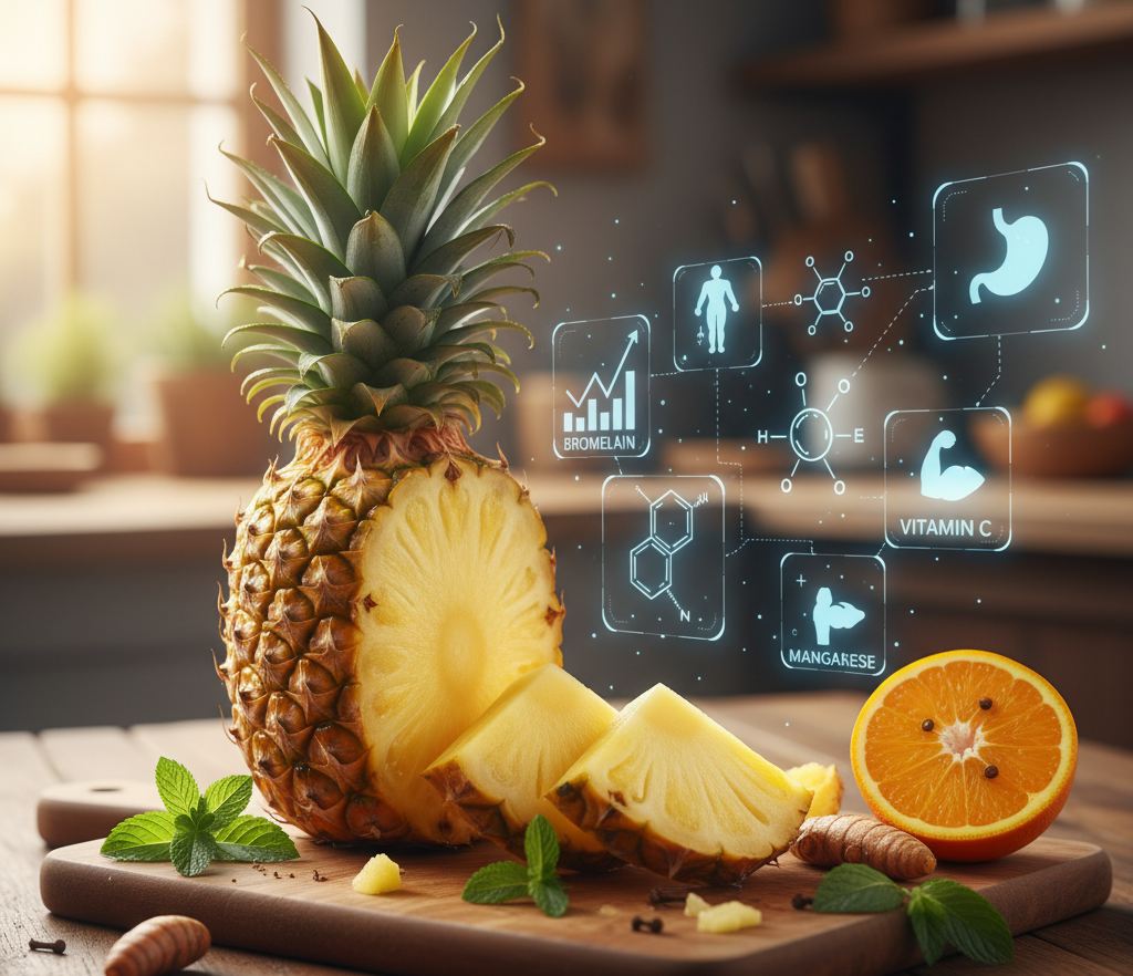 പൈനാപ്പിളിന്റെ ഏറ്റവും പ്രധാനപ്പെട്ട പ്രത്യേകതകളിലൊന്നാണ് അതിൽ മാത്രം കാണുന്ന ബ്രോമെലൈൻ (Bromelain) എന്ന എൻസൈം. ഈ എൻസൈം നിരവധി ആരോഗ്യപരമായ ഗുണങ്ങൾ നൽകുന്നു: